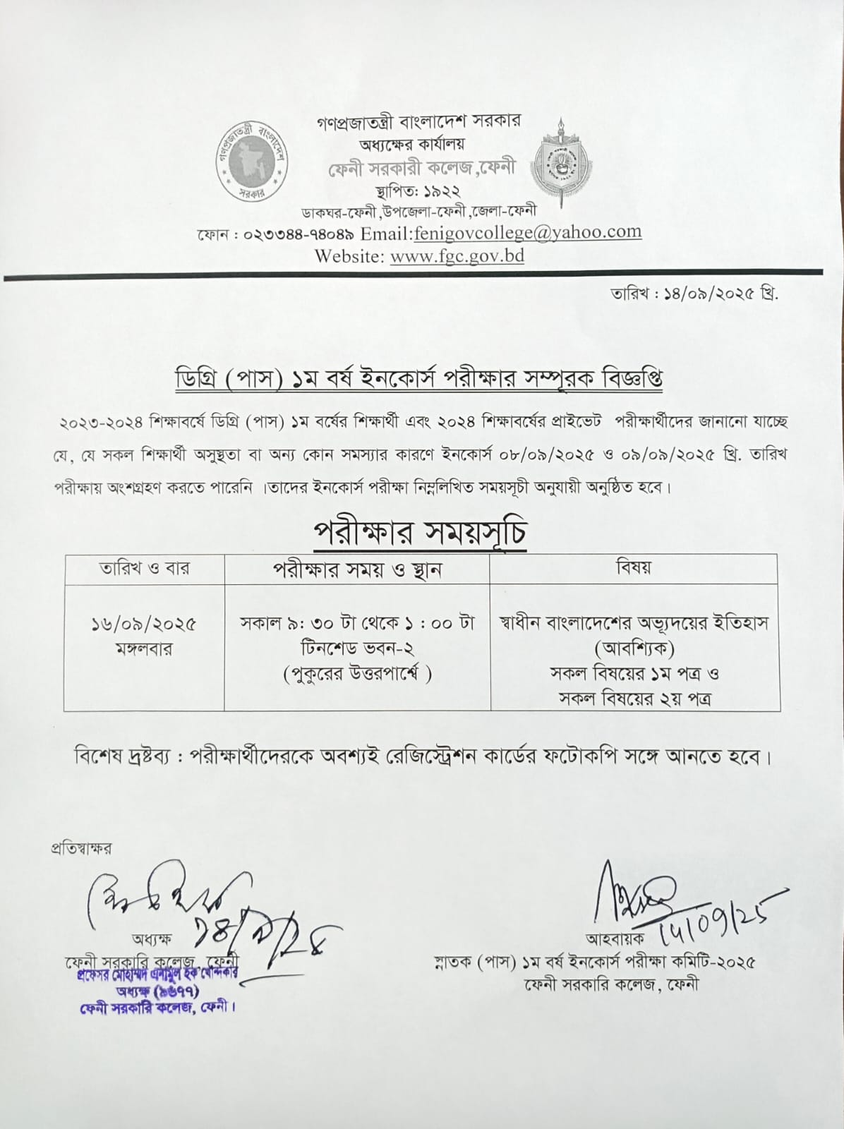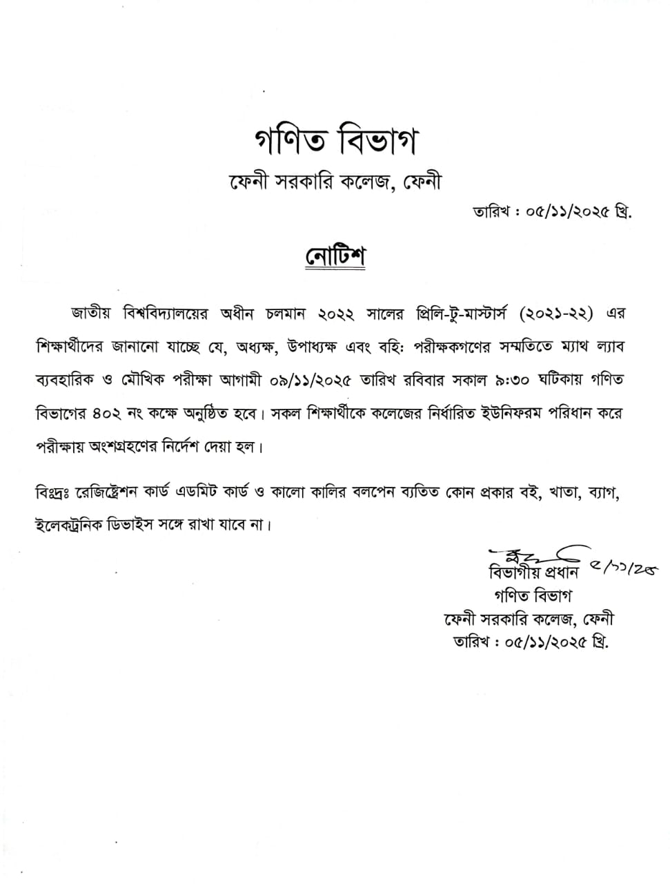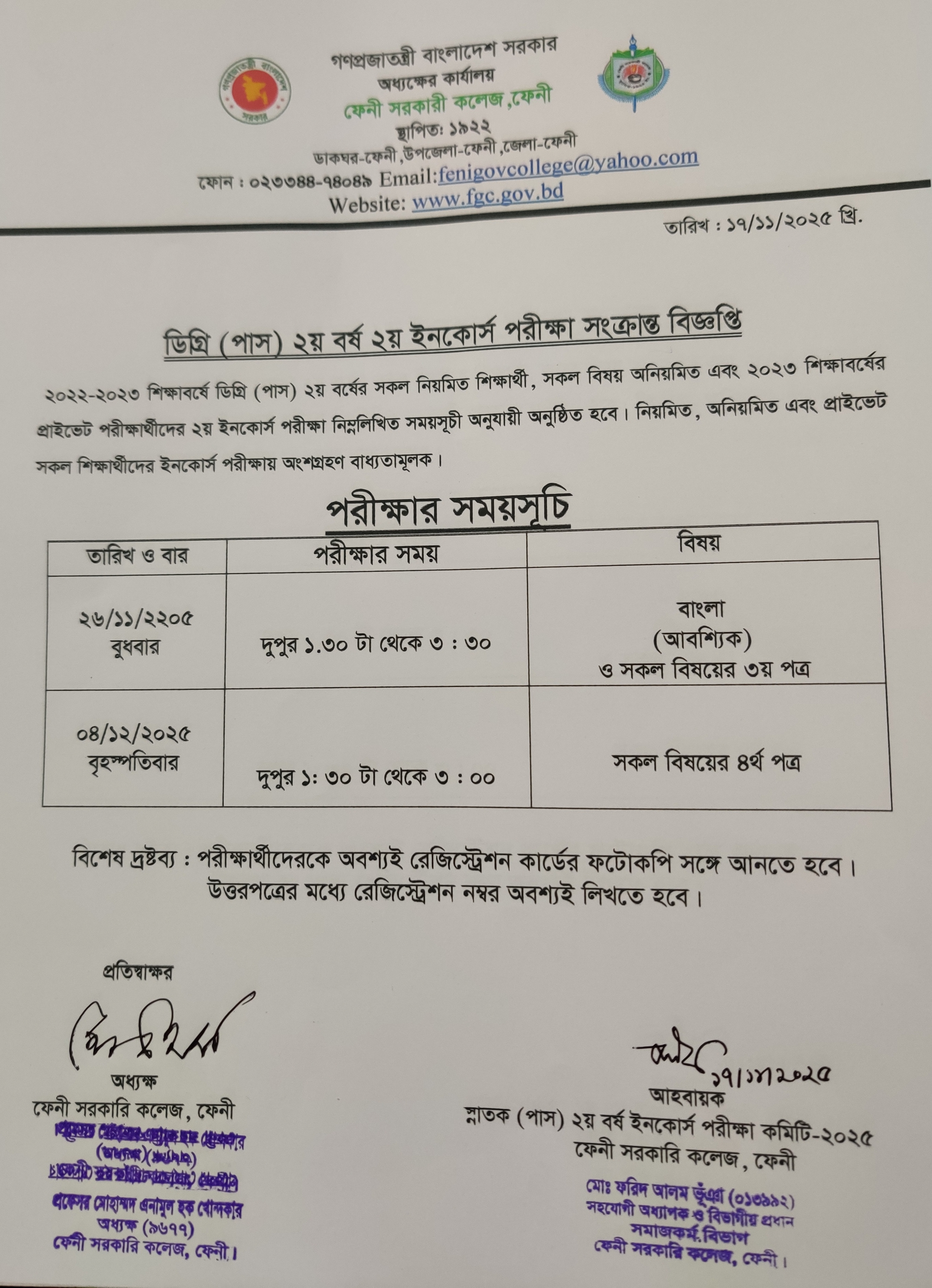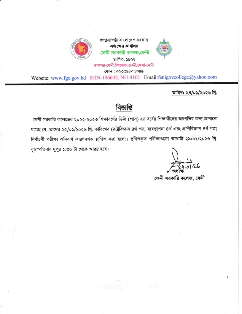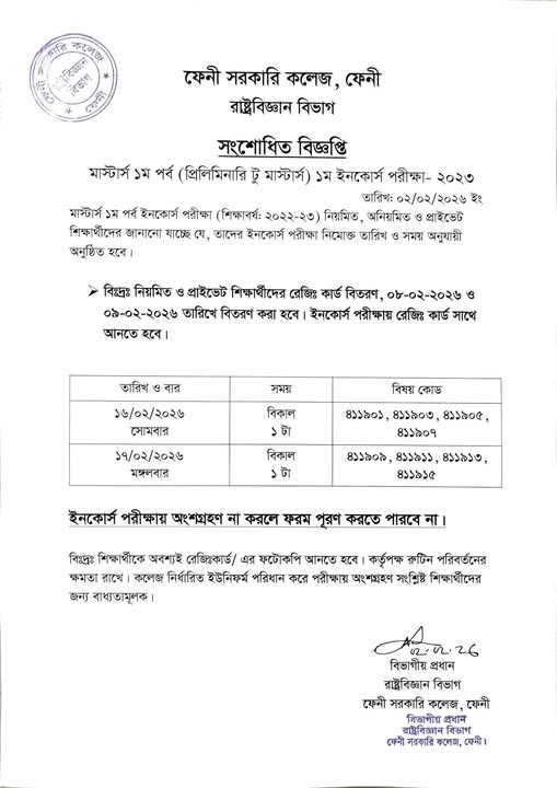 সংশোধিত বিজ্ঞপ্তি ইনকোর্স পরীক্ষা-২০২৩ প্রিলিমিনারী টু মাস্টার্স রাষ্ট্রবিজ্ঞান বিভাগ ফেনী সরকারি কলেজ। |