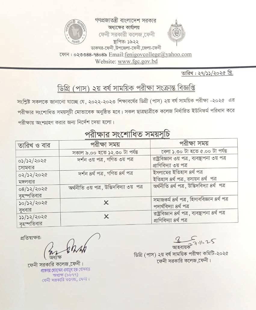 ডিগ্রি (পাস) ৩য় বর্ষ ইনকোর্স পরীক্ষা-২০২৬ এর সময়সূচি |