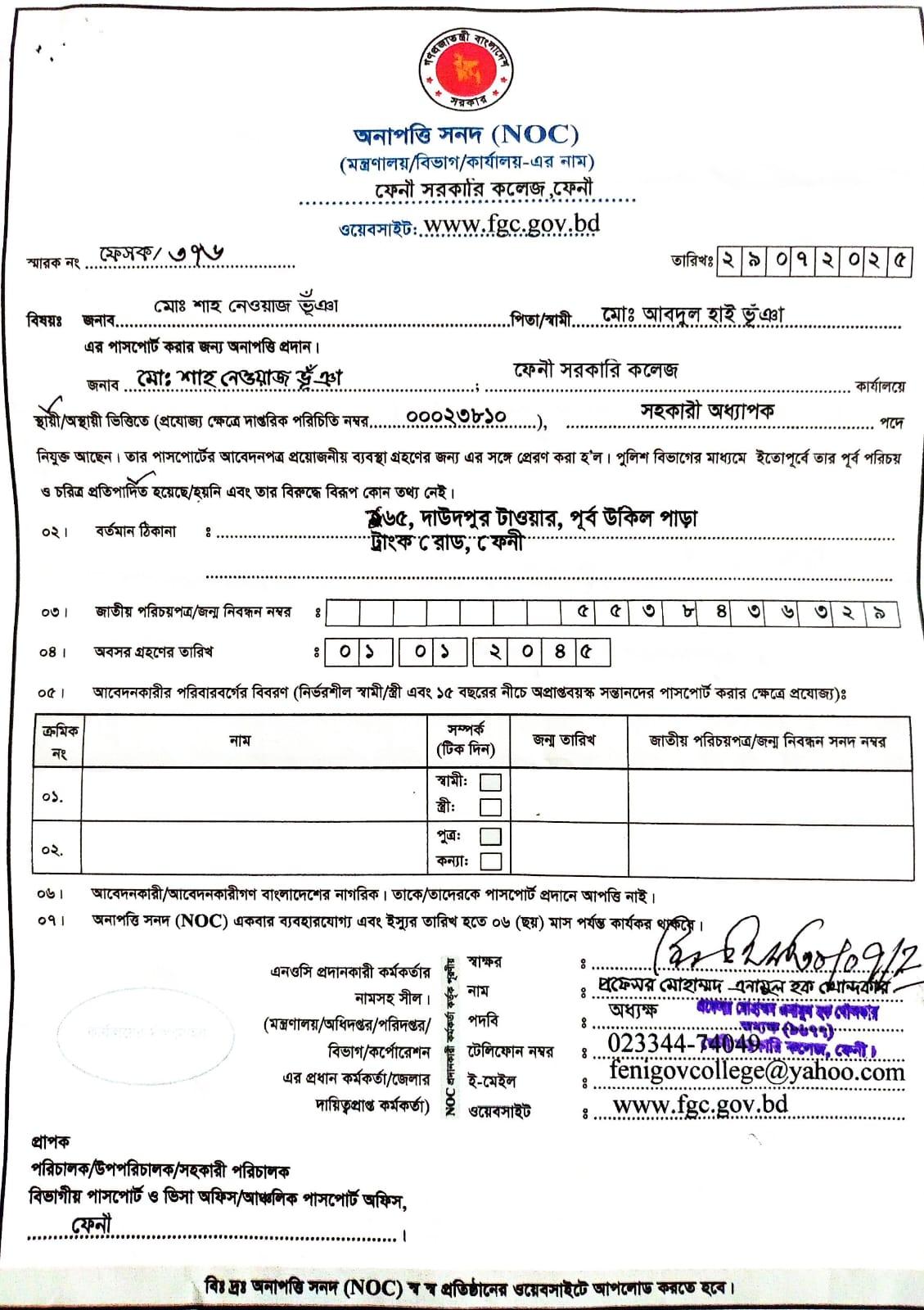 জনাব মোঃ আশরাফ উদ্দিন, সহকারী অধ্যাপক, ইতিহাস এর অনাপত্তি সনদপত্র |