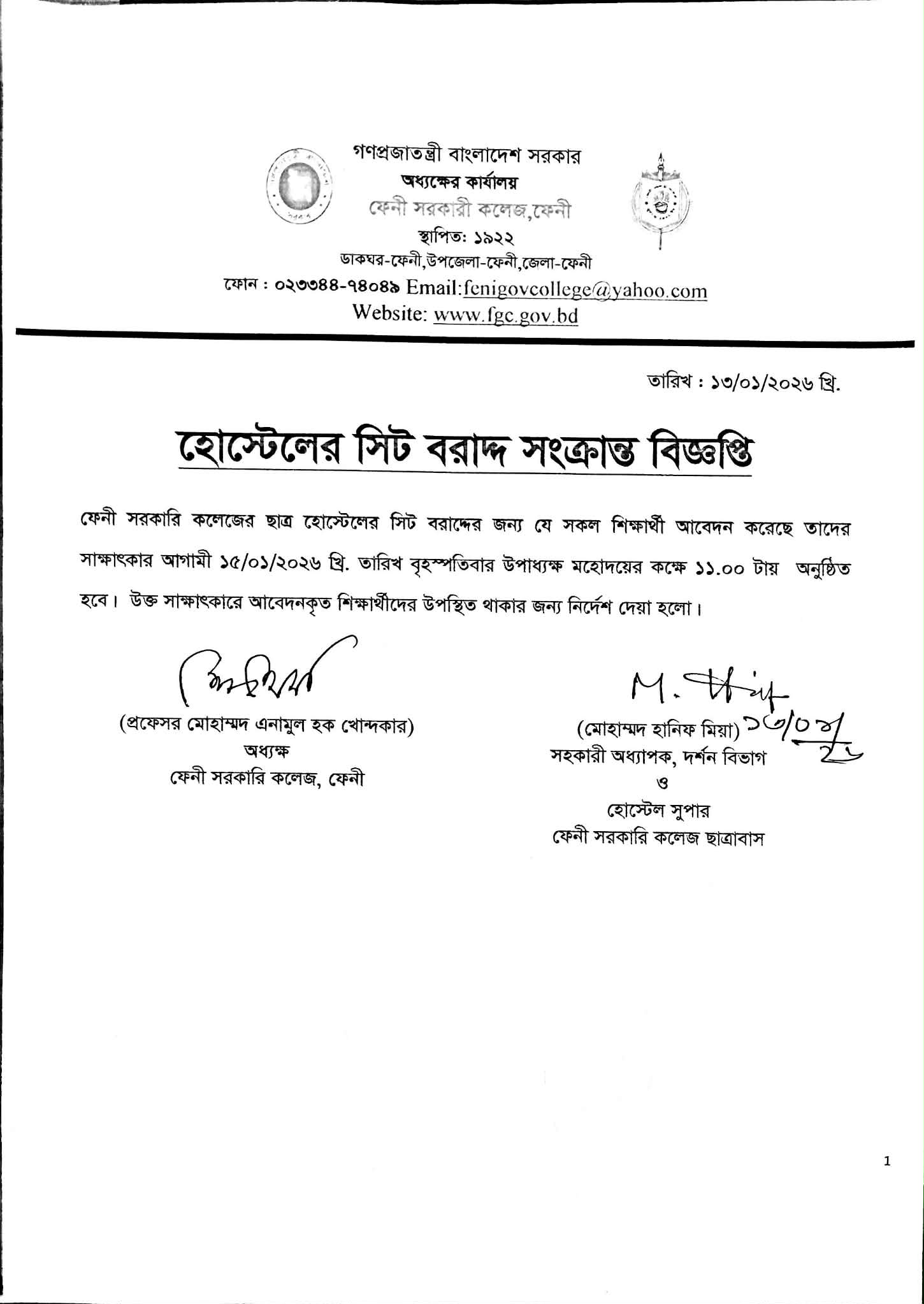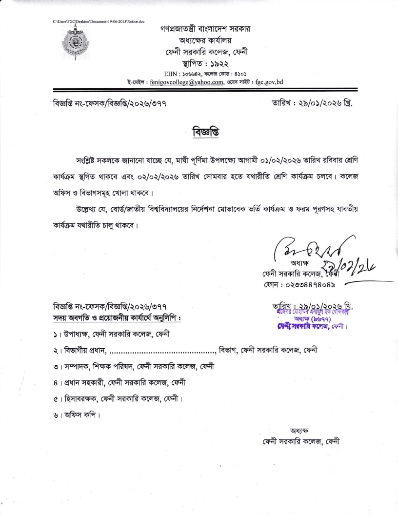 ত্রয়োদশ জাতীয় সংসদ নির্বাচন ও গণভোট উপলক্ষ্যে কলেজ বন্ধ এবং শ্রী শ্রী শিবরাত্রি ব্রত উপলক্ষ্যে শ্রেণি কার্যক্রম স্থগিত সংক্রান্ত বিজ্ঞপ্তি |